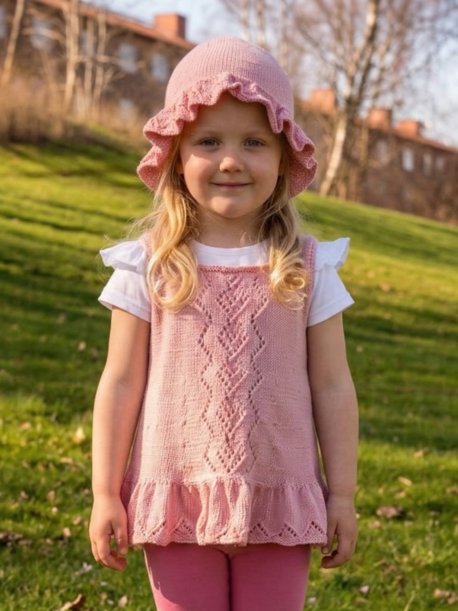 Tunikaen er strikket i økologisk bomull. Bakstykket og forstykket strikkes separat med fellinger for fasong og ermehull. Forstykket er dekorert med et fint mønster i henhold til diagrammet. Til luen legger du opp masker og strikker glattstrikk før du former luen med vanlige fellinger. En dekorativ volang plukkes opp langs kanten og strikkes med et mønster for å gi luen karakter.