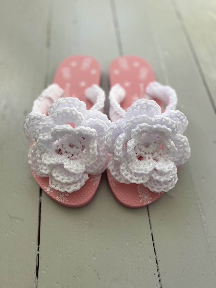 Pimp flipflopsene dine. Hekle rundt stroppen og deretter hekle blomsten og du er klar for sommeren.