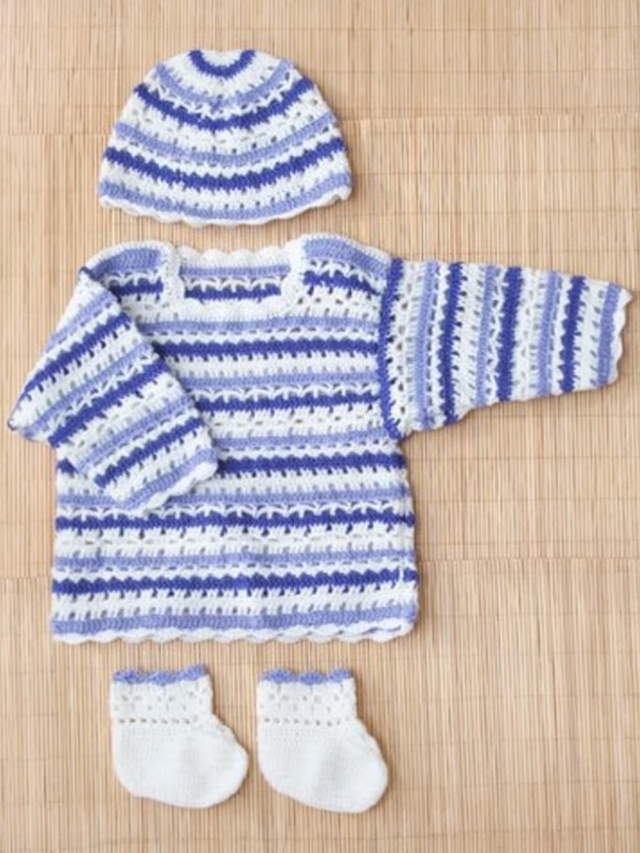 Lag et søtt sett til de små med dette heklemønsteret for genser , lue og sokker . Plaggene er heklet i det myke akrylgarnet Piggelen. Mønsteret inneholder flere forskjellige teknikker, inkludert staver, halve staver og luftmaskemellomrom som skaper vakre strukturmønstre. Genseren har en praktisk lukking med seks knapper. Settet finnes i størrelser fra 3 til 18 måneder. Ved å kombinere tre forskjellige farger får plaggene et livlig og lekent utseende som er perfekt for babyens garderobe.