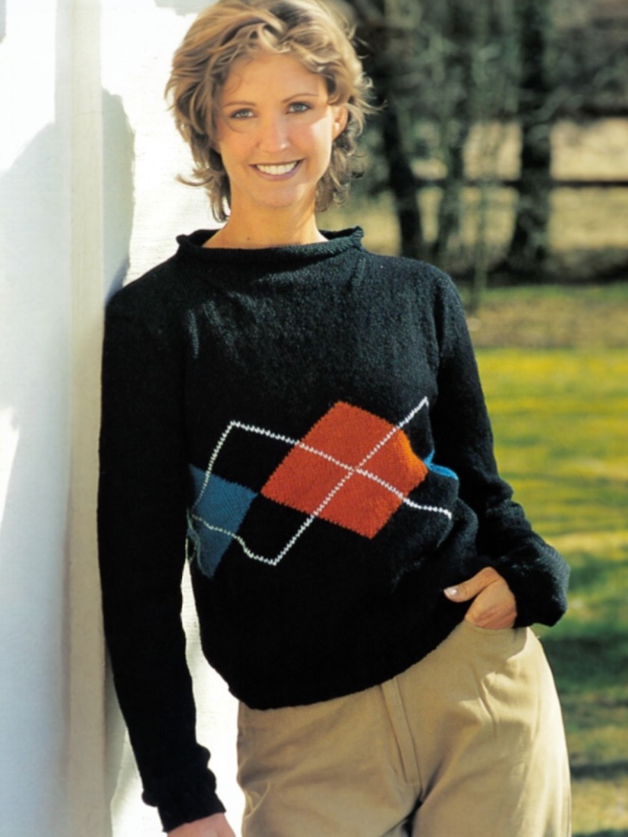 Denne genseren med harlekinruter. Bak- og forstykkene starter med en ribbestrikk før de bytter pinne til glattstrikk. Mønsteret lages ved å følge fargeskiftdiagrammet og brodere detaljer med glattstrikk etterpå. Ermene strikkes separat og sys på etter at skuldersømmene er lukket.