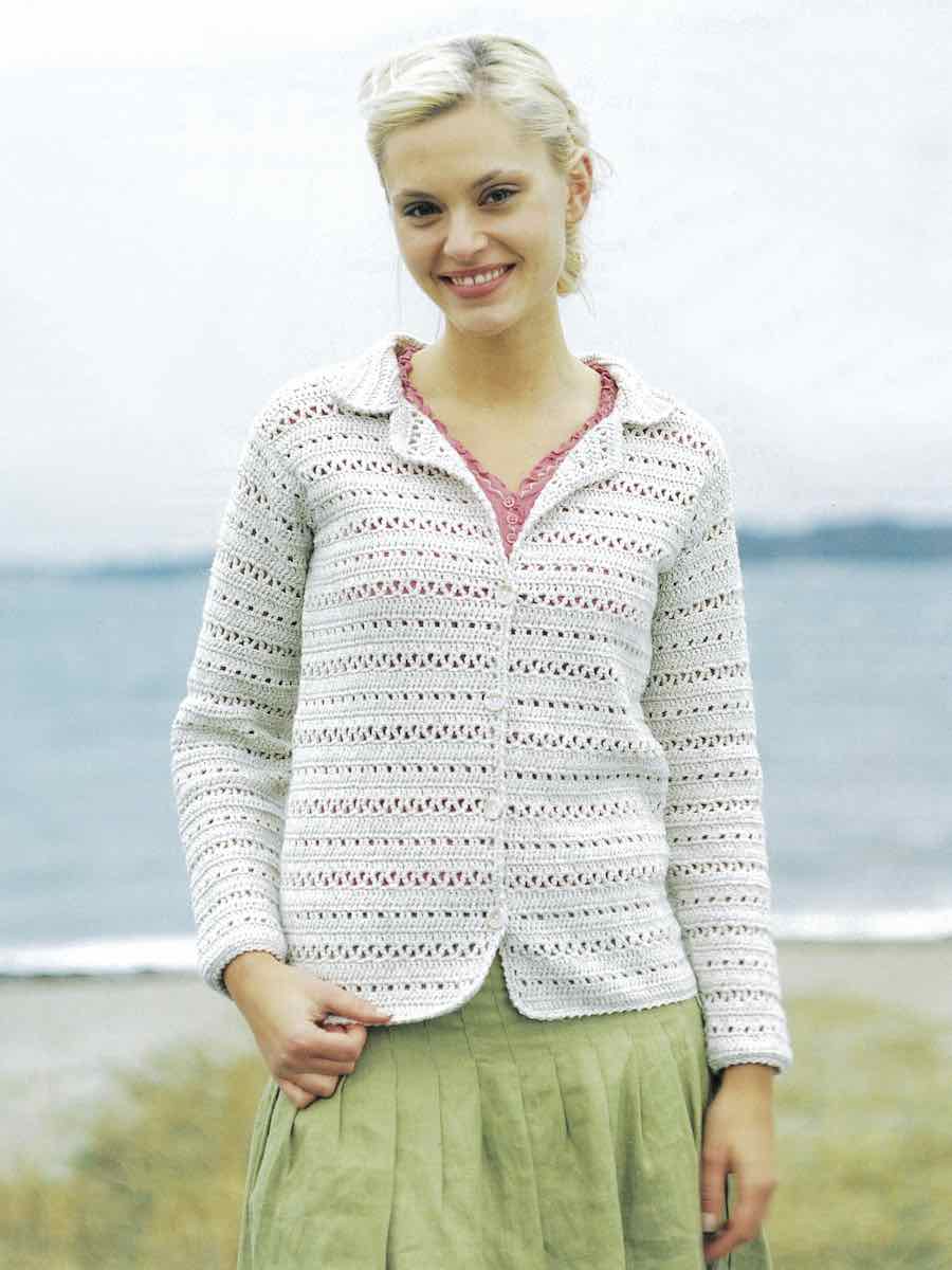 Hekle bak- og forstykkene til jakken og ermene separat i mønsteret. Monter delene, hekle kragen rundt forkantene og halsen, avslutt med knapphull og knapper.
