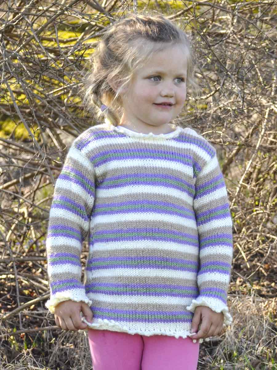 Genser strikket rundt i glattstrikk med striper, delt ved ermehullene og formet med fellinger. Forstykke, bakstykke og ermer sys sammen. Hals- og ermekanter strikkes separat og avsluttes med knapper.