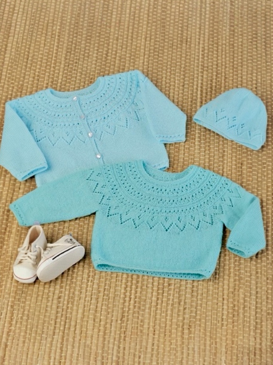 Tilbehør: Genser: 2 knapper. Cardigan: 5 knapper.