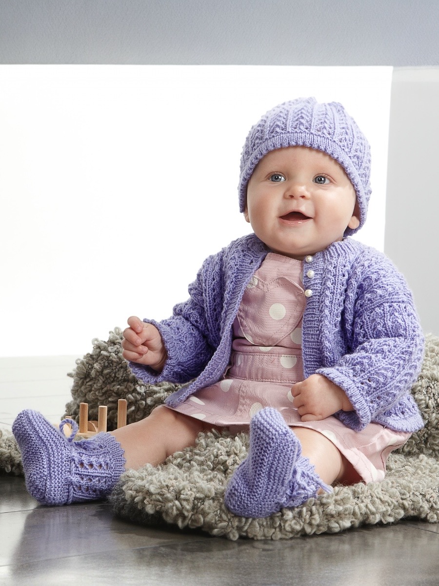 Et romantisk sett med blondestrikket cardigan , tanktopp , lue og sokker . Cardiganen får sin karakter fra et dekorativt grafisk mønster og elegant blondearbeid langs kantene. Den lukkes med tre knapper og har en klassisk passform.