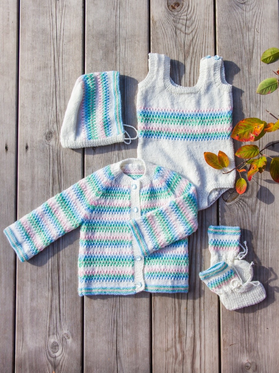 Tilbehør: 5 små knapper til cardiganen. 4 små knapper til buksene.