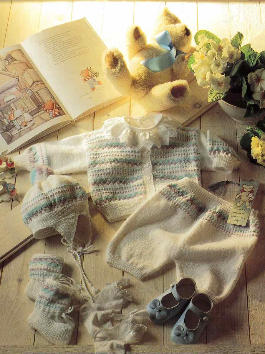 Strikket cardigan, bukse, lue og sokker i myk akryl etter diagrammet og glattstrikk. Plaggene formes med økninger og fellinger og strikkes i deler som sys sammen. Luen har elastisk kant og øreklaffer. Avslutt med montering og strikk der det trengs.
