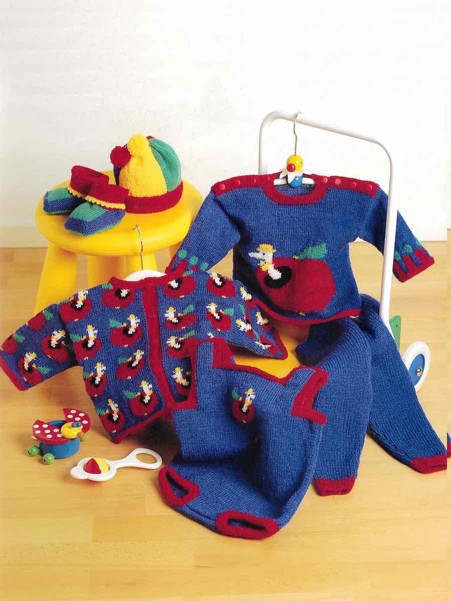 Genser, cardigan, bukser, lue og sokker – alt i mykt Piggelen-garn. Plaggene strikkes i deler nedenfra og opp, med diagrammer for mønsterstrikk. Cardiganen har knappestolpe, luen er elastisk og sokkene strikkes rundt for god passform.