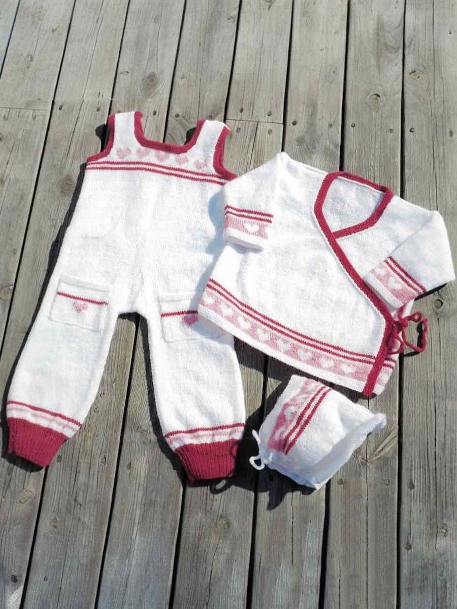 Søtt babysett med hjertemotiv i Piggelen-garn. Cardigan, bukser, lue og kyse strikkes i deler og settes sammen. Diagrammet med hjerter strikkes etter mønster. Plaggene har fine detaljer som knapper, kantmasker og snorer.