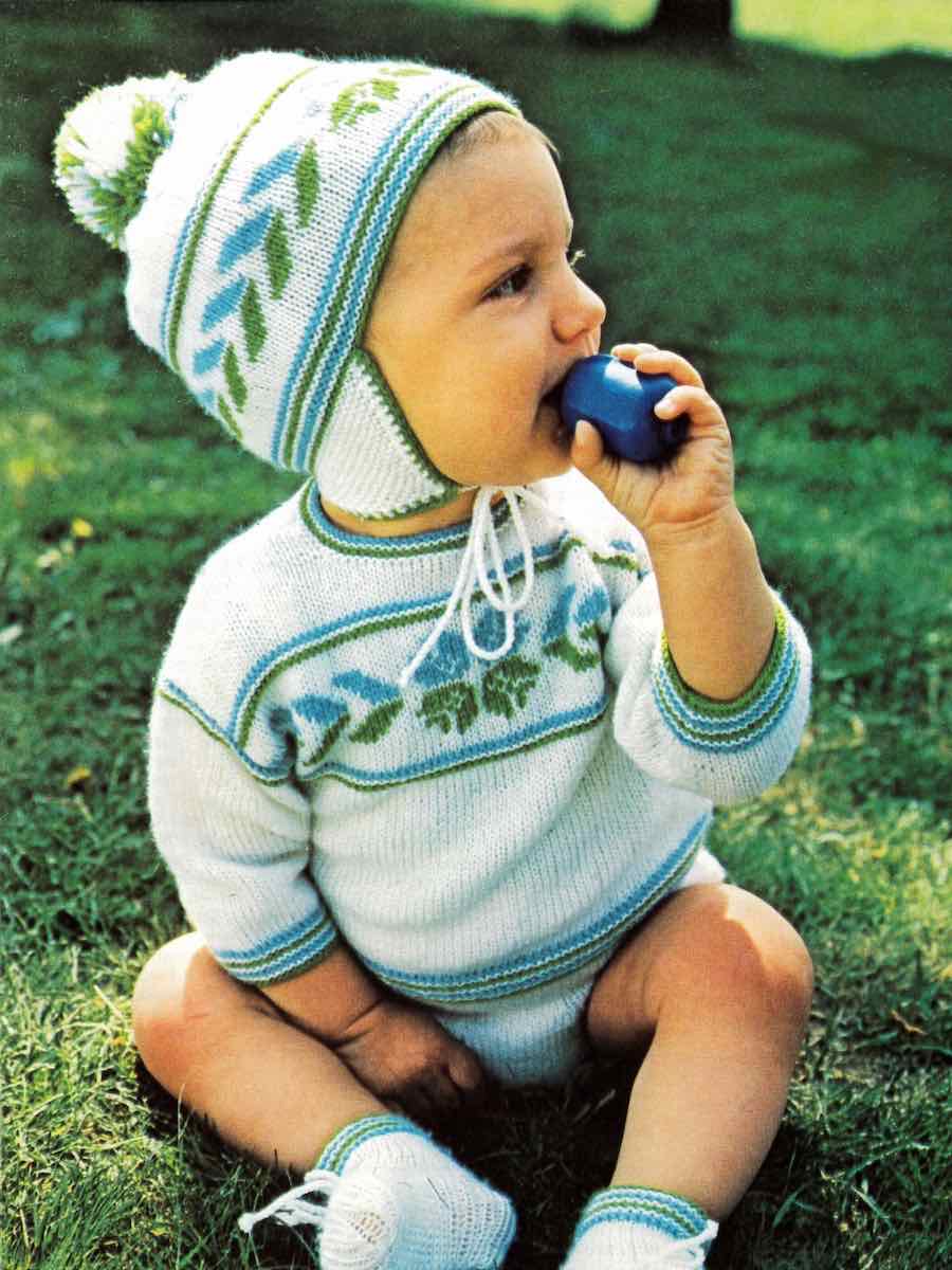 Sett med genser, bukse, lue og sokker i Piggelen-garn. Plaggene strikkes nedenfra og opp med ribbekanter og raglanfellinger. Genseren har knappestolpe, buksene har strikk i livet, luen strikkes nedenfra, og sokkene er i glattstrikk med formet hæl og tå.