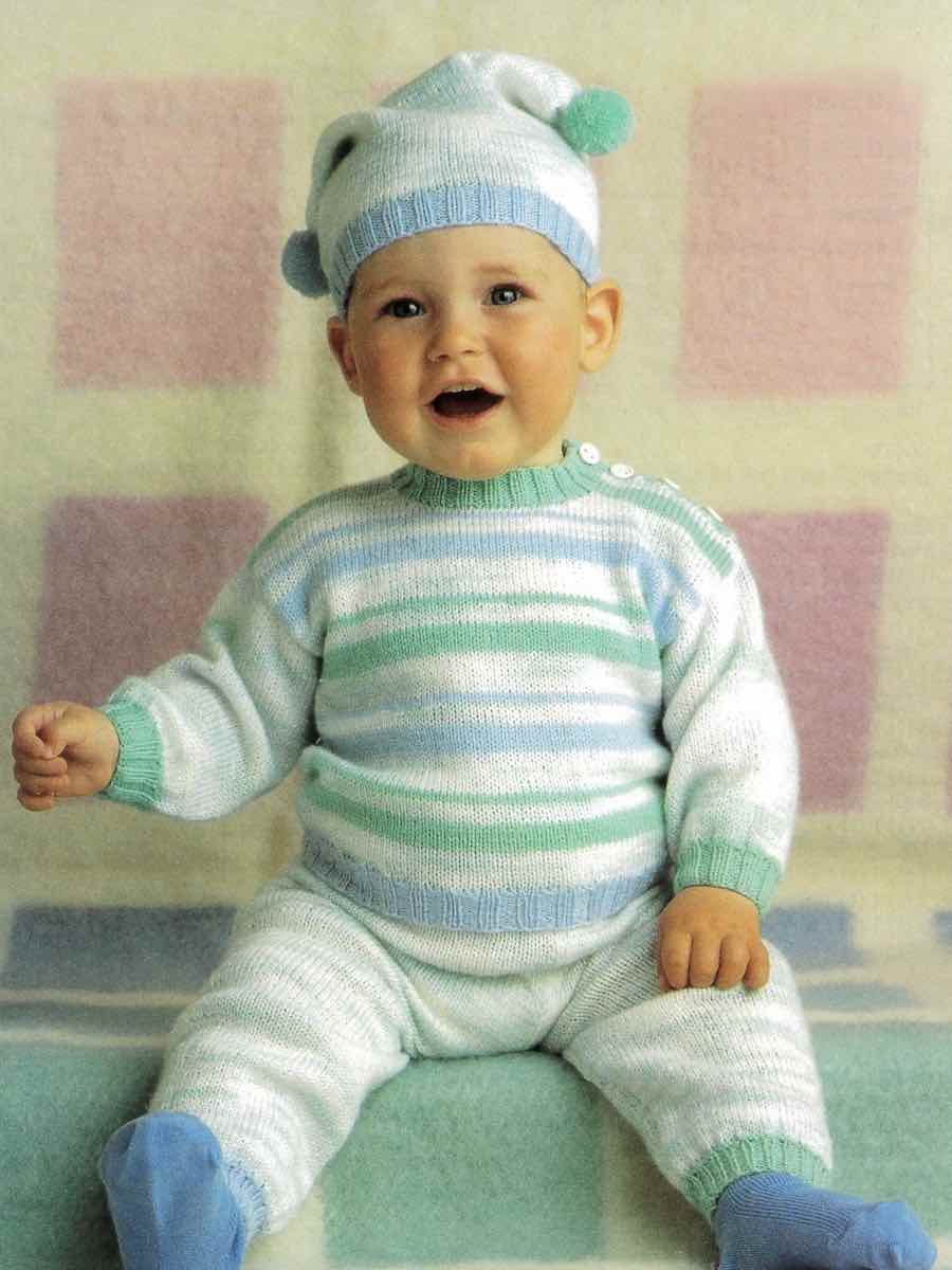 Søt barnesett i Piggelen-garn. Genseren er strikket med elastikk og glattstrikk, raglanermer og stripedetalj. Buksene er strikket med elastikk og figurstrikking. Lue med elastisk kant, strikket i rundpinnen.