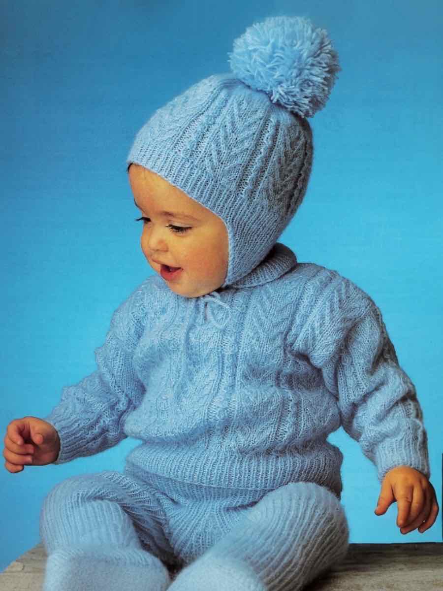 Sett til baby: genser, bukse, lue og sokker i strikk og glattstrikk. Alle deler strikkes nedenfra og opp. Genseren har en knapp i halsen. Øreklaffer og strikk strikkes direkte på luen. Buksen har snøring og strikk. Montering med lett blokkering.