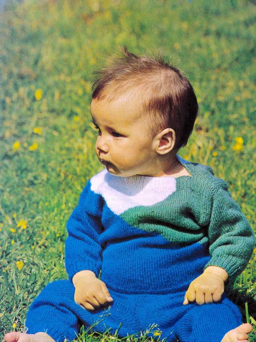 Sett med genser og bukse i et stilig diagonalt design. Genseren strikkes nedenfra og opp med intarsiadiagrammer i to farger og raglanermer. Buksene strikkes med elastisk midje, bena fra livet og ned, med innstikk for en god passform.