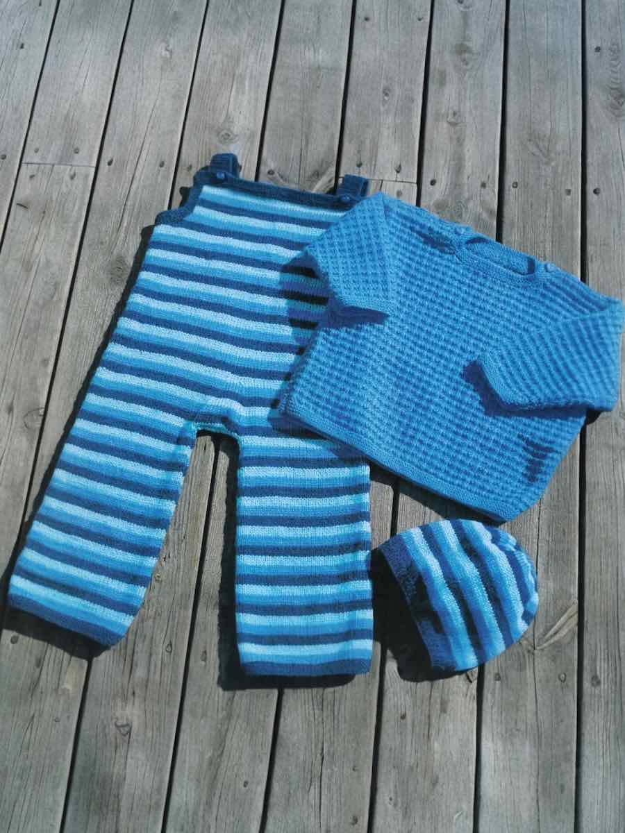 Genser, stripete bukse og lue i Piggelen-garn. Plaggene strikkes nedenfra og opp i deler med et strukturert mønster etter diagrammet. Fell av til hals og ermhull, sy sammen og avslutt med kantsømmer og montering.