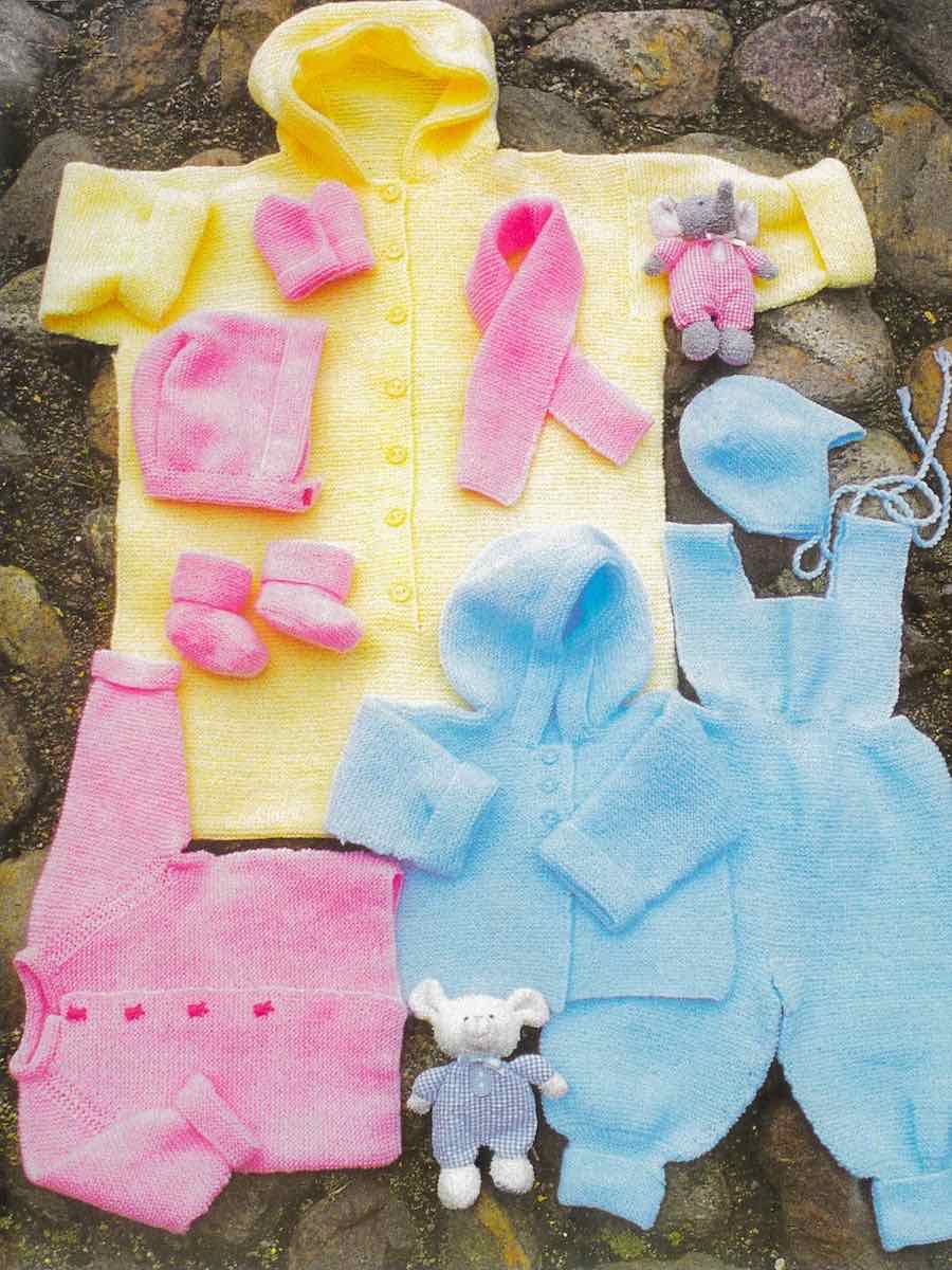 Fint babysett med cardigan, jakke, bukse, hjelm, lue, sokker, skjerf, votter og sovepose i mykt garn. Plaggene strikkes i deler, vanligvis nedenfra og opp med tettsittende ermer.
