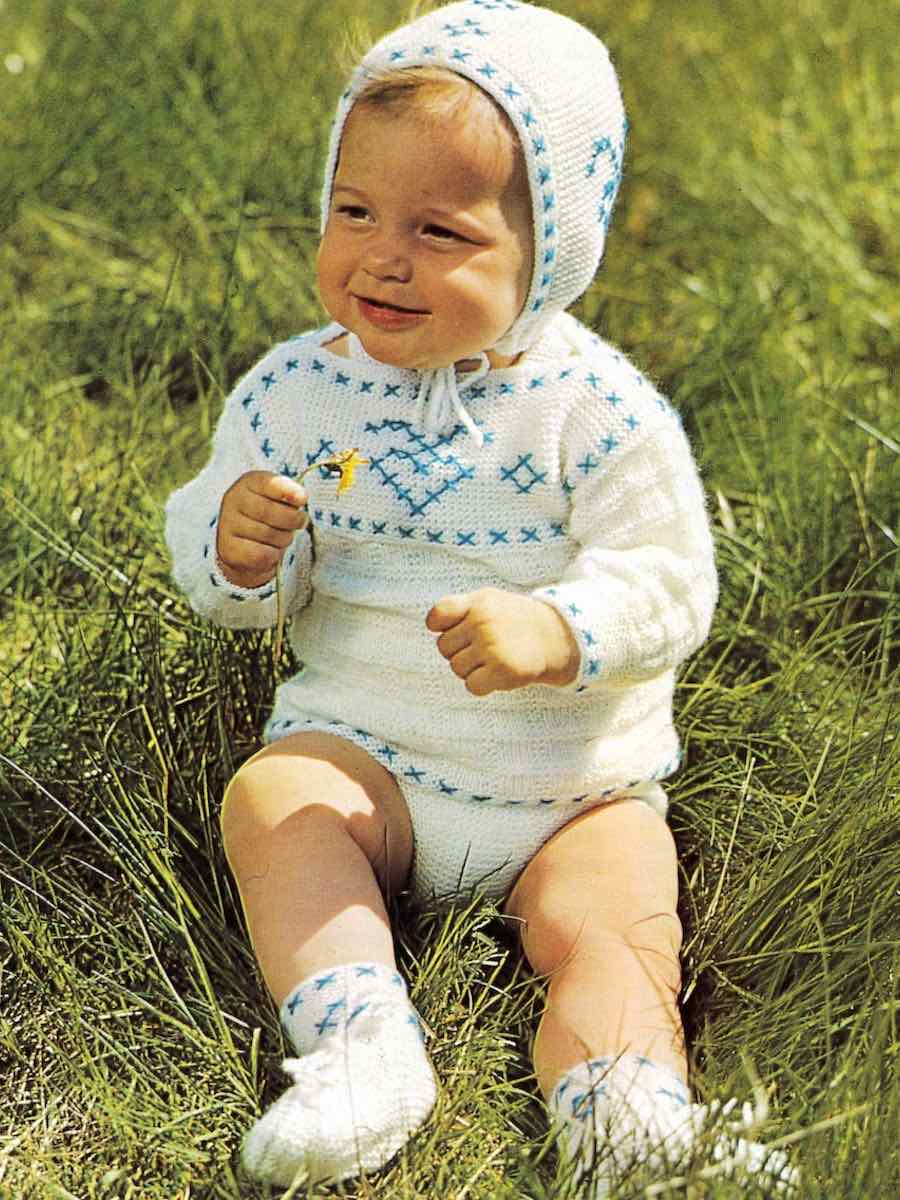 Sjarmerende barnesett med korsstingbroderi! Gensere, bukser, luer og sokker strikkes i Piggelen. Alle delene strikkes i glattstrikk med ribbekanter. Korssting sys etterpå i henhold til diagrammet.