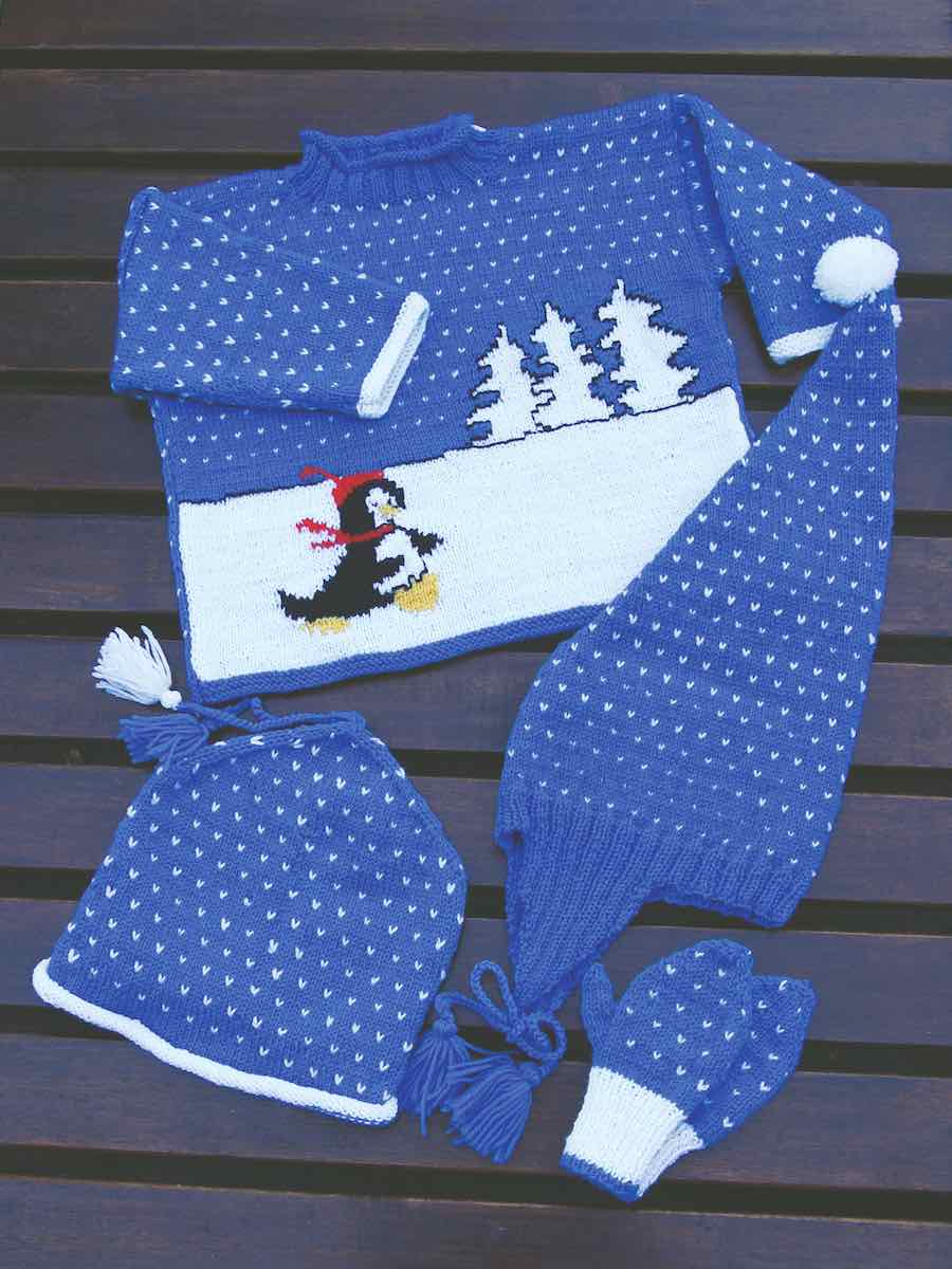 Strikk en pingvingenser, lue og votter i flerfarget strikking! Plaggene strikkes i deler med diagrammer, innsydde ermer og hekledetaljer.