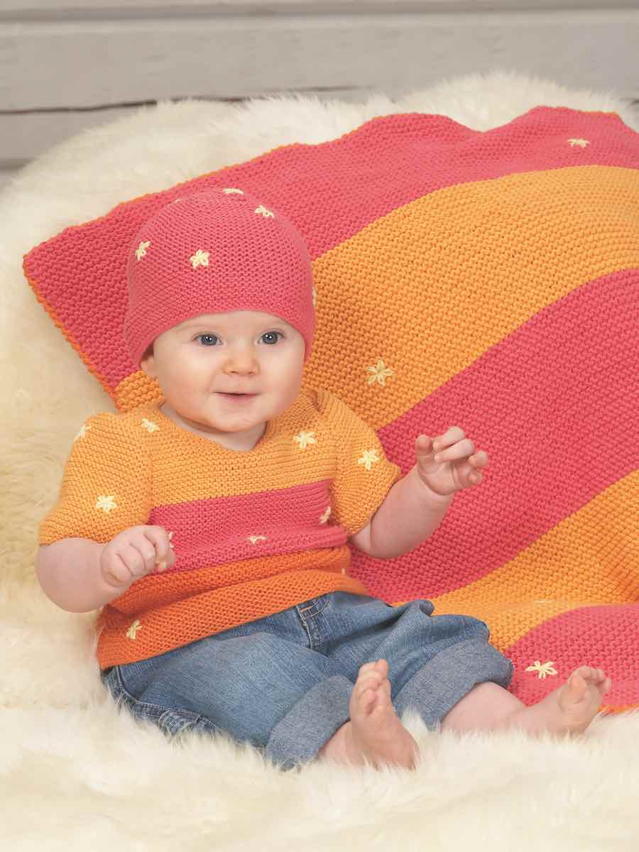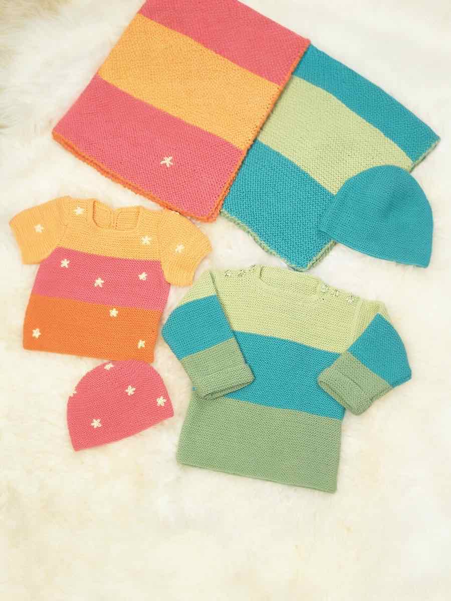 Gensere, luer og tepper strikkes i rillestrikk med fargeskift i bomullsgarn. Plaggene strikkes i deler på tynne pinner og sys sammen. Halskantene og teppekantene hekles, og dekorasjonene broderes eller hekles.