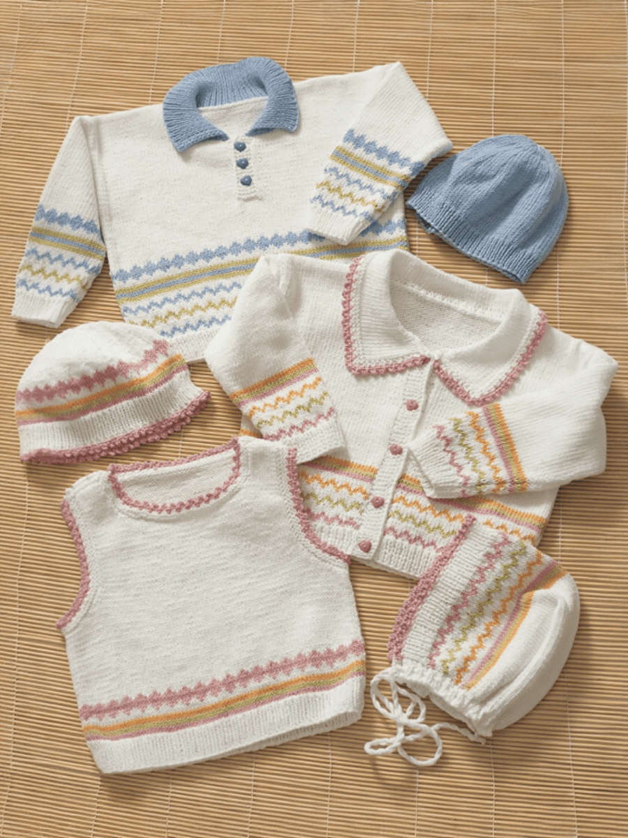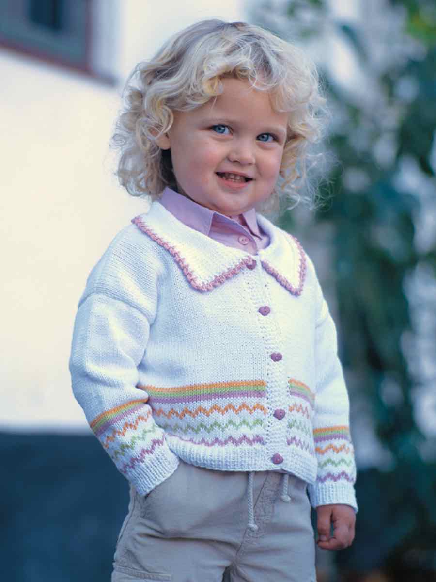 Strikk et fargerikt barnesett i bomull med genser, cardigan, topp, lue, kyse og tanktopp i mønster etter diagrammet. Plaggene strikkes i deler med økninger, vrangbord og knapphull. Pynt med heklede picotkanter, snorer og dusker.