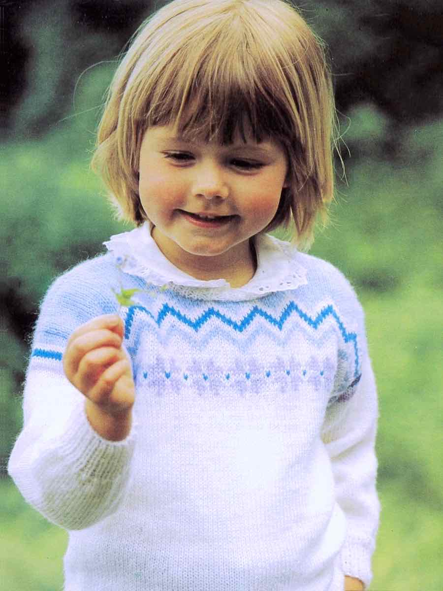 Fargerik genser i flerfarget strikk med sikksakkmønster. Strikkes nedenfra og opp i deler, ermene hver for seg. Halsringning og stolpe plukkes opp og strikkes etterpå.