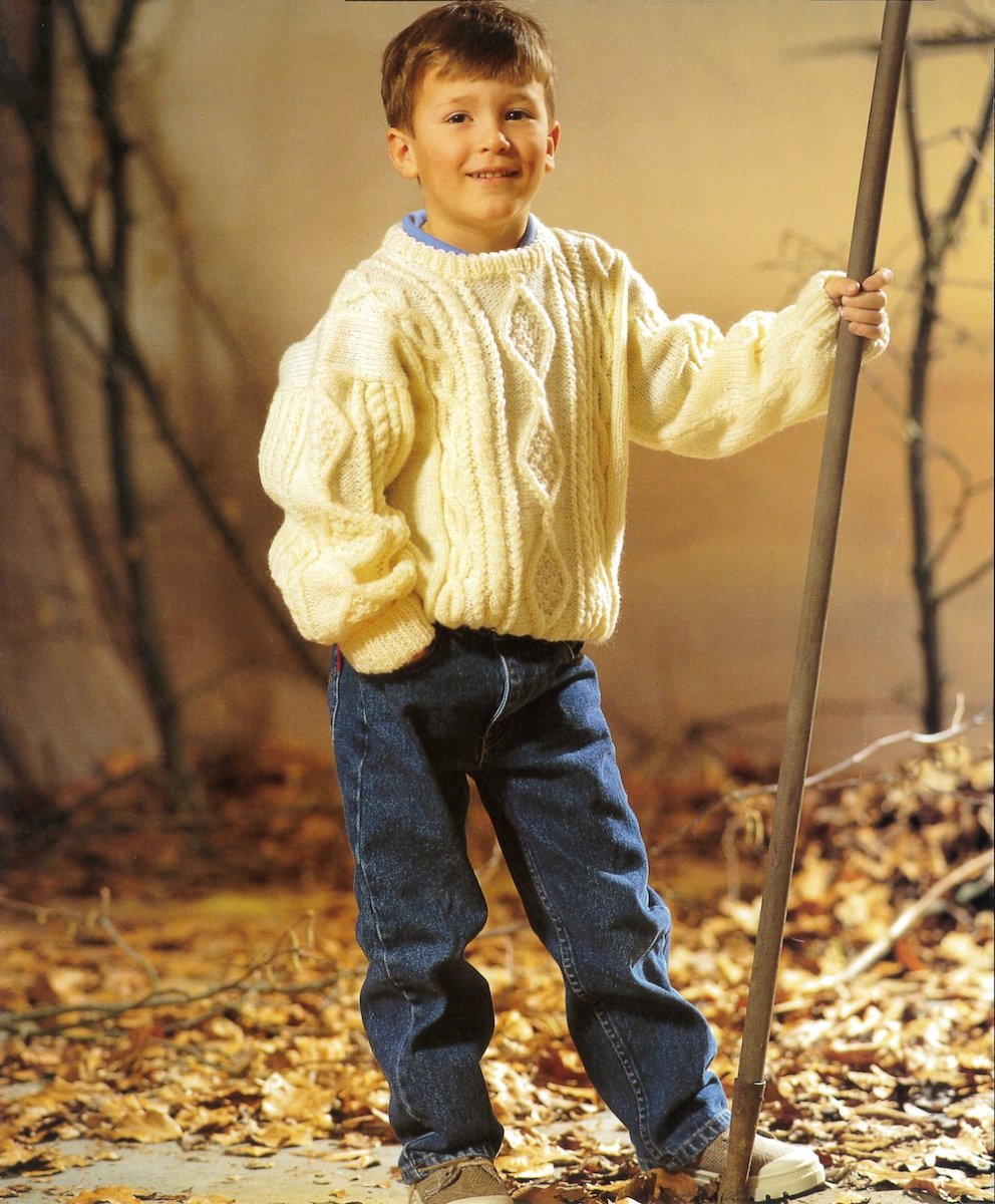 Familiemønster med mange fletter og strukturelle mønstre. Modellene strikkes i deler som er sydd sammen.