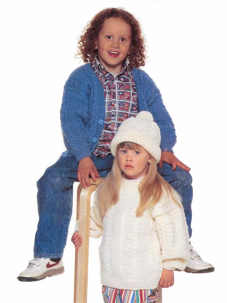 Genseren og cardiganen er strikket i deler som er sydd sammen. Plaggene er strikket i perlestrikk.