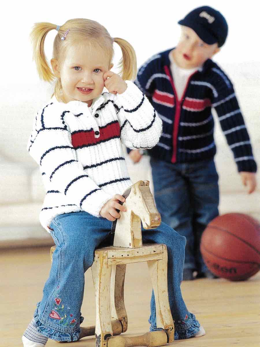 Genser og cardigan strikket på tradisjonelt vis i deler. Mønsteret er tilgjengelig med splitt, knapper eller glidelås.