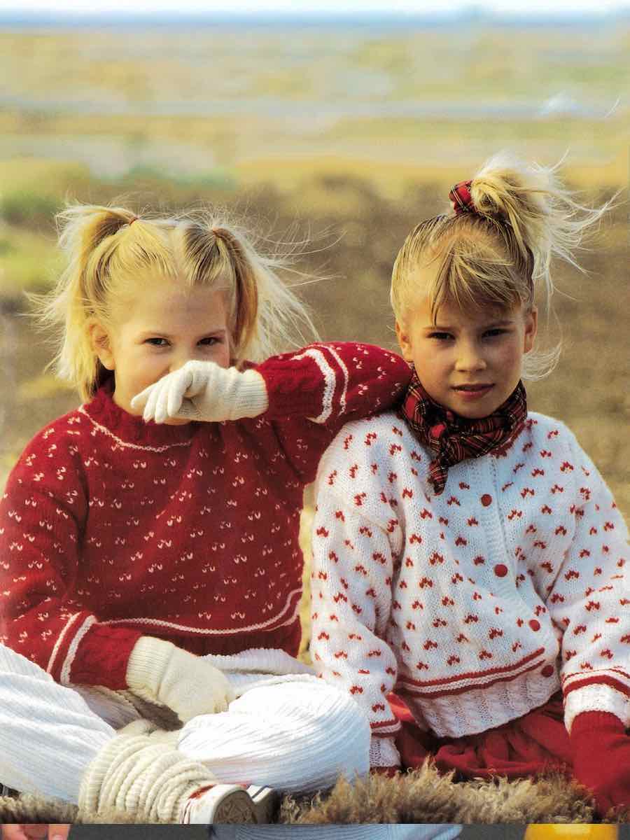 Barnegensere og cardigans strikkes tradisjonelt i fire deler som er sydd sammen. Kantene på reisevesken er strikket med fletter.
