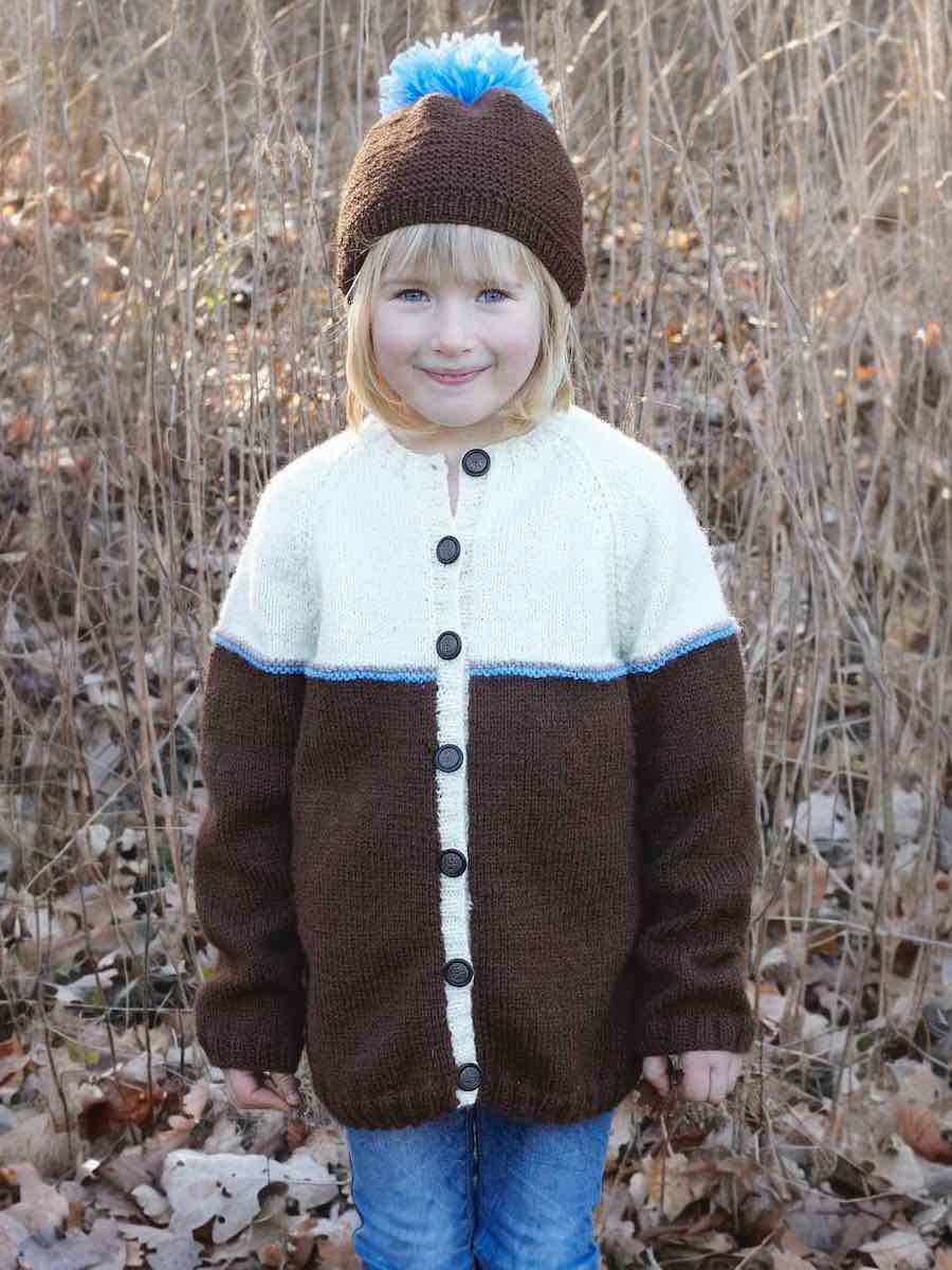 Genser, cardigan og lue strikket i ribbestrikk og glattstrikk med raglan. Delene formes med fellinger, sys sammen og avsluttes med kanter. Cardiganen har knapper, og luen strikkes ovenfra og ned med en dusk.