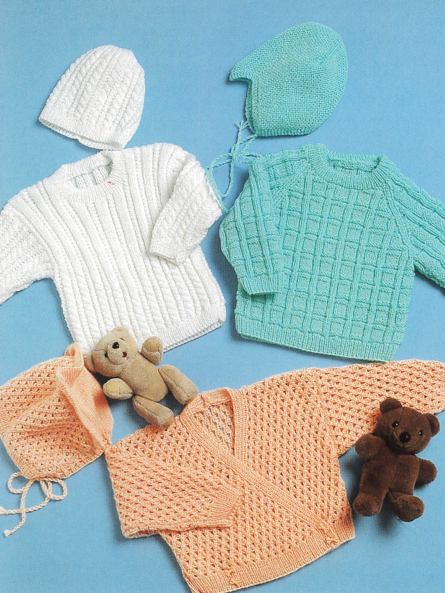 Mønster med mange deler å velge mellom. Cardigans, gensere med raglan, innsydde ermer. Også tre forskjellige hatter.