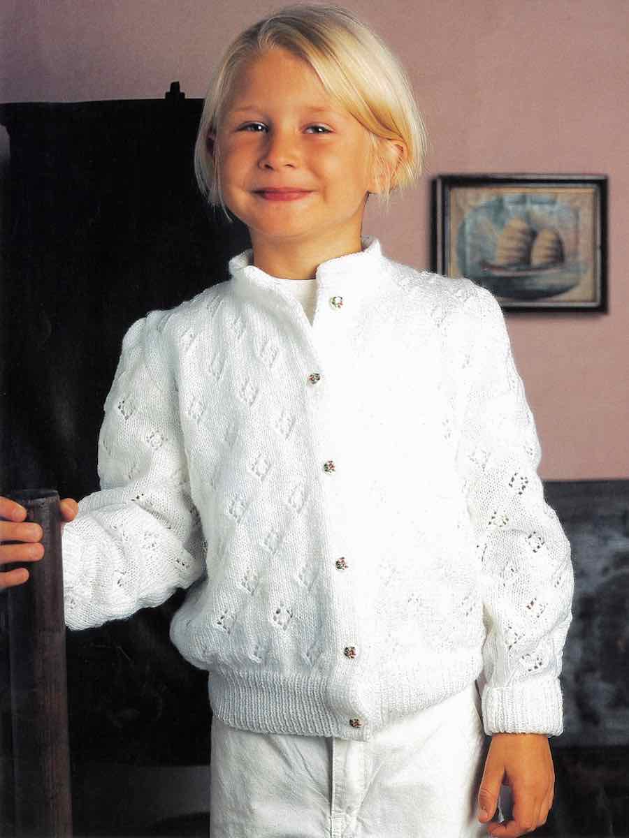 Søt jentecardigan i et strukturert mønster med et fint diagram. Cardiganen strikkes nedenfra og opp i deler. Ermene strikkes separat og sys fast. Halsringning og stolpe plukkes opp og strikkes.