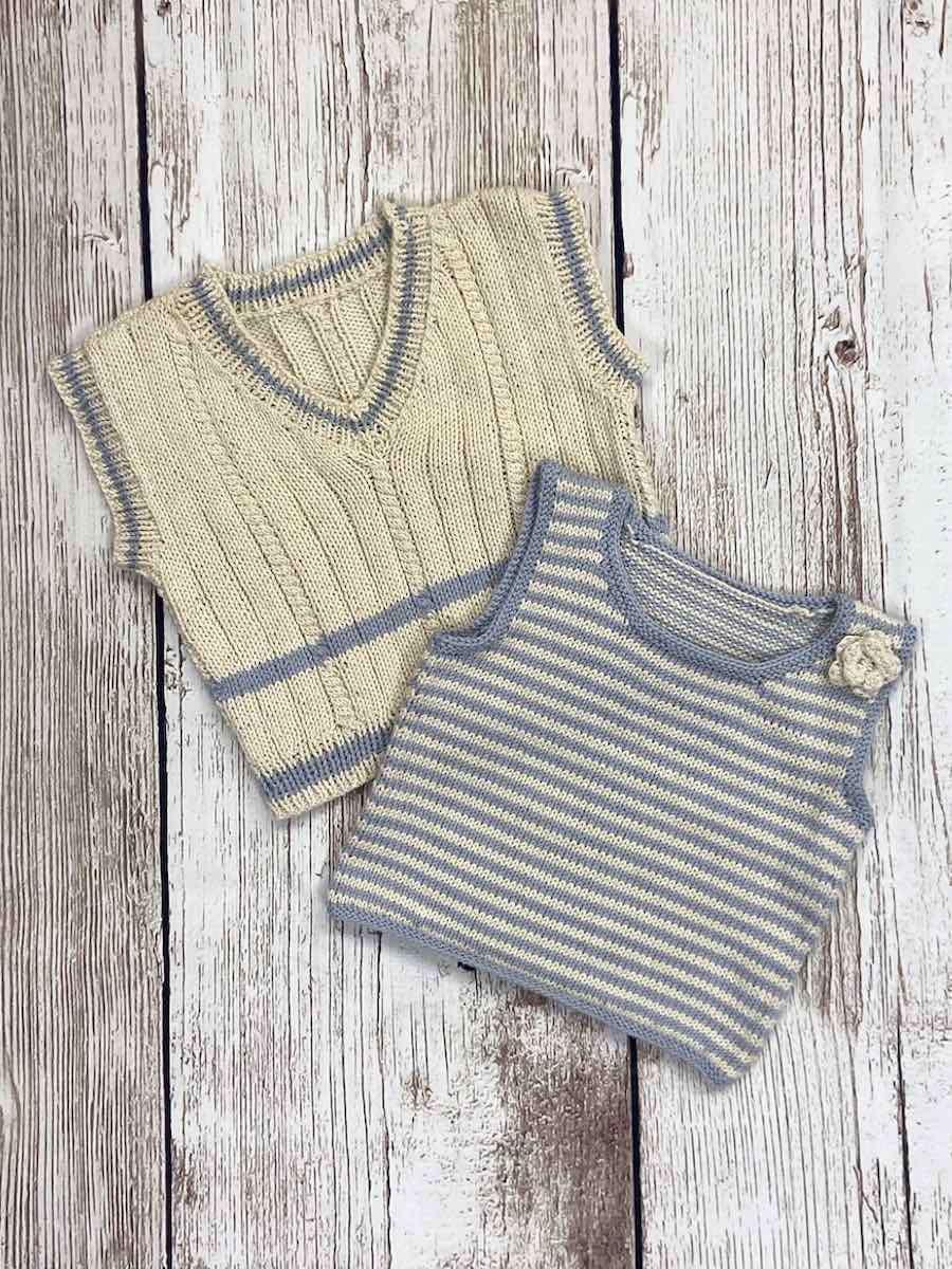 Lin og slipover, perfekt plagg for de minste. Strikket på tradisjonell måte. Slipoveren har små fletter som gjør plagget mer interessant. Linen har en liten blomst som er heklet og sydd på.