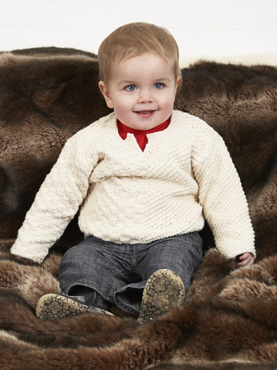 Strikk en tidløs barnetunika . Arbeidet er delt inn i bakstykke, forstykke og ermer, som strikkes på pinne 3 mm. Ved å veksle mellom rett- og vrangmasker lager du en stilig struktur med vertikale striper langs sidene. Du former plagget med enkle fellinger til ermehull og halsutringning. Avslutt med å plukke opp masker til en fin ribbestrikket halsutringning og hekle glatte knapphullsløyfer ved skulderen for enkel påkledning.