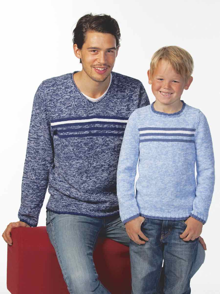 Genserne strikkes nedenfra og opp i glattstrikk med ensfarget bunn og stripete kant øverst. Ermene er sydd fast og halsutringningen avsluttes med ribbestrikk.