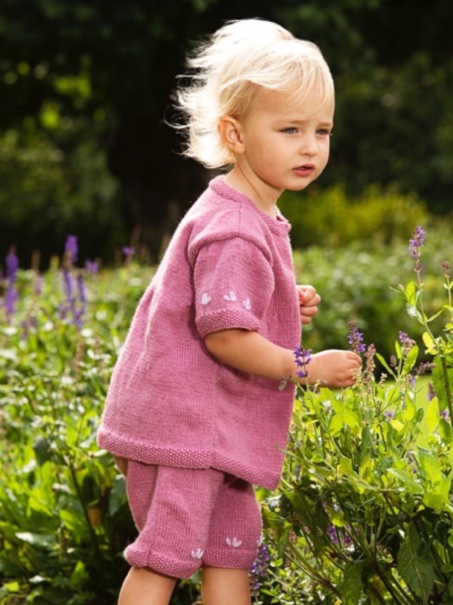 Tunikaen og buksen strikkes med perlestrikkkant før de fortsetter i glattstrikk. Tunikaen har en praktisk splitt foran og korte ermer. Buksen strikkes i to deler som er sammenføyd i skrittet, med en heving bak for bedre passform. Som en fin avslutning er små hvite blomster brodert nederst på både ermer og ben, og tunikaen er forsynt med en heklet knapphullshempe.