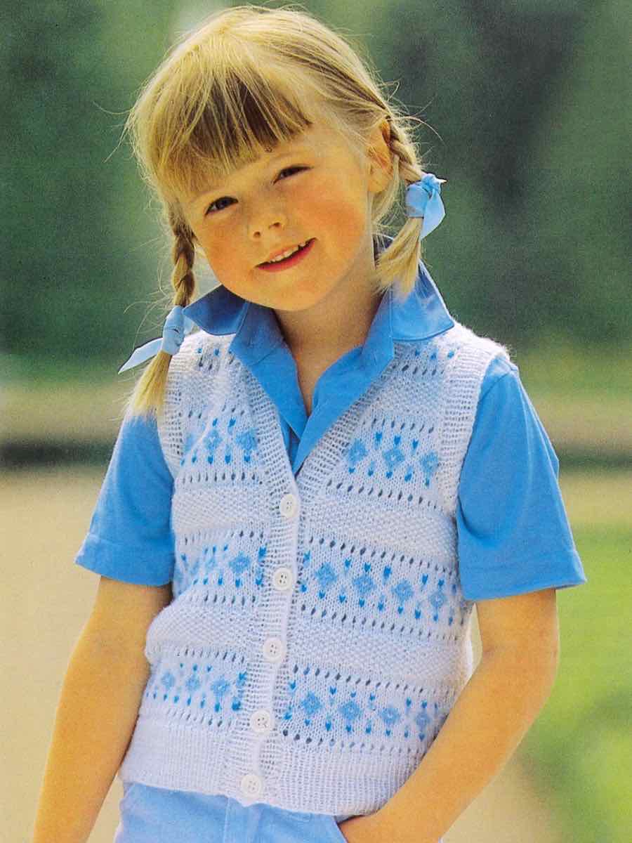 Barnegenser. Genseren strikkes i flerfargede mønstre i henhold til diagrammet, nedenfra og opp i deler som er sydd sammen. Ermene strikkes separat, og halsen formes med avfellinger. Knappestolpe på høyre foran.