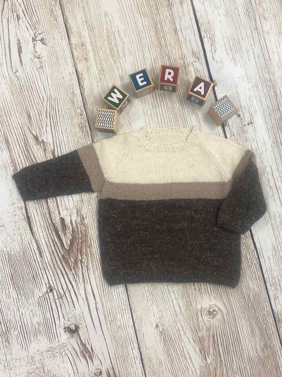 Babygenser strikket nedenfra og opp på rundstrikkepinner opp til ermehullet. Genseren har raglan-ermer som gjør plagget veldig behagelig for små barn.
