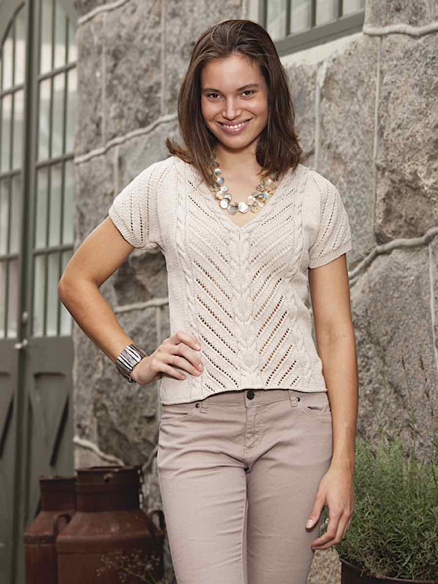 Strikk en blondemønstret genser i bomullsgarn med diagrammer. Både for- og bakstykket formes med økninger og fellinger, ermene strikkes direkte og avsluttes med en skulderfelling.
