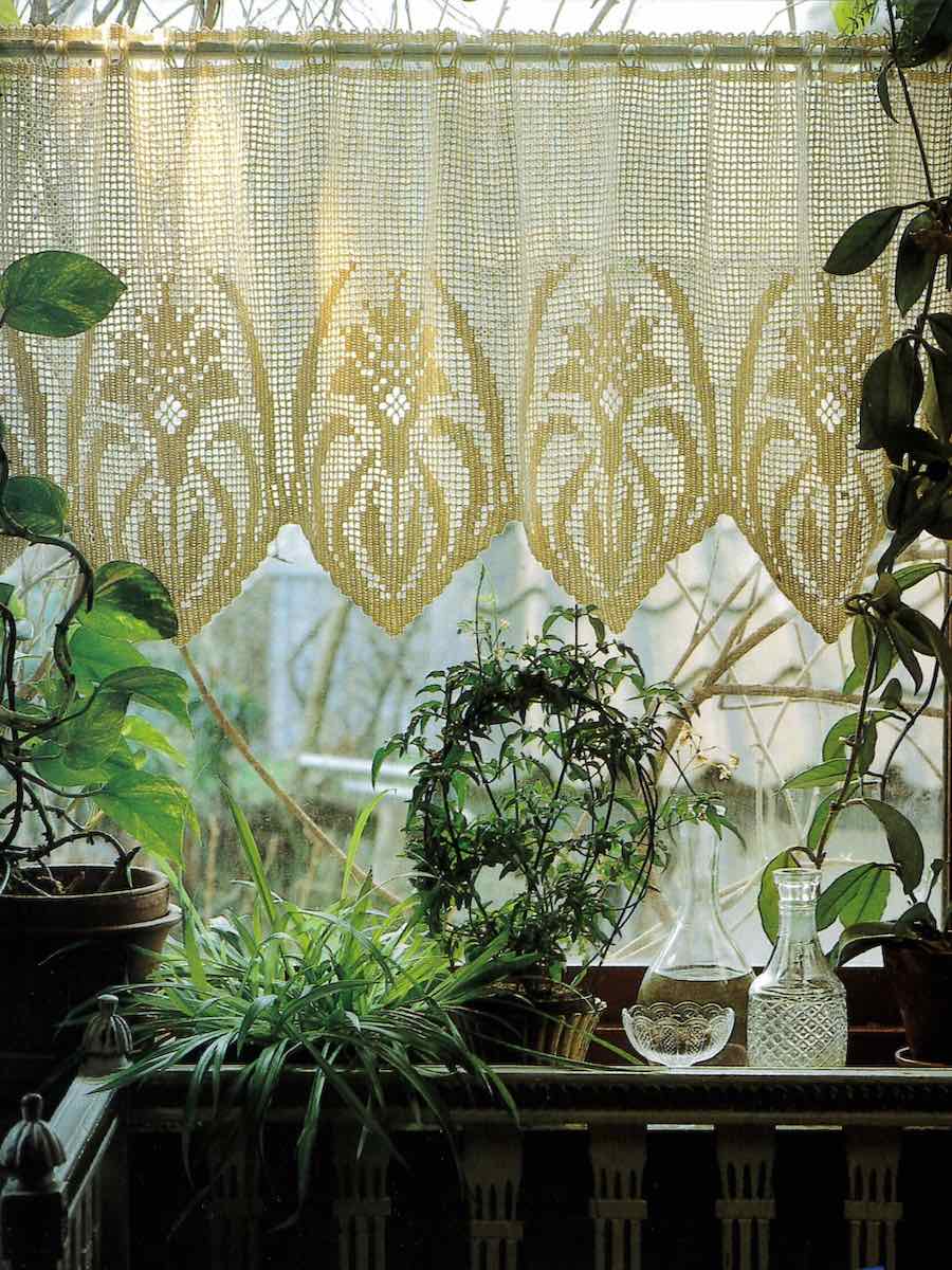 Hekle denne gardinstangen. Mønsteret består av staver, luftmaskebuer og økninger/fellinger. Hvert motiv gjentas over hele bredden for et jevnt resultat.