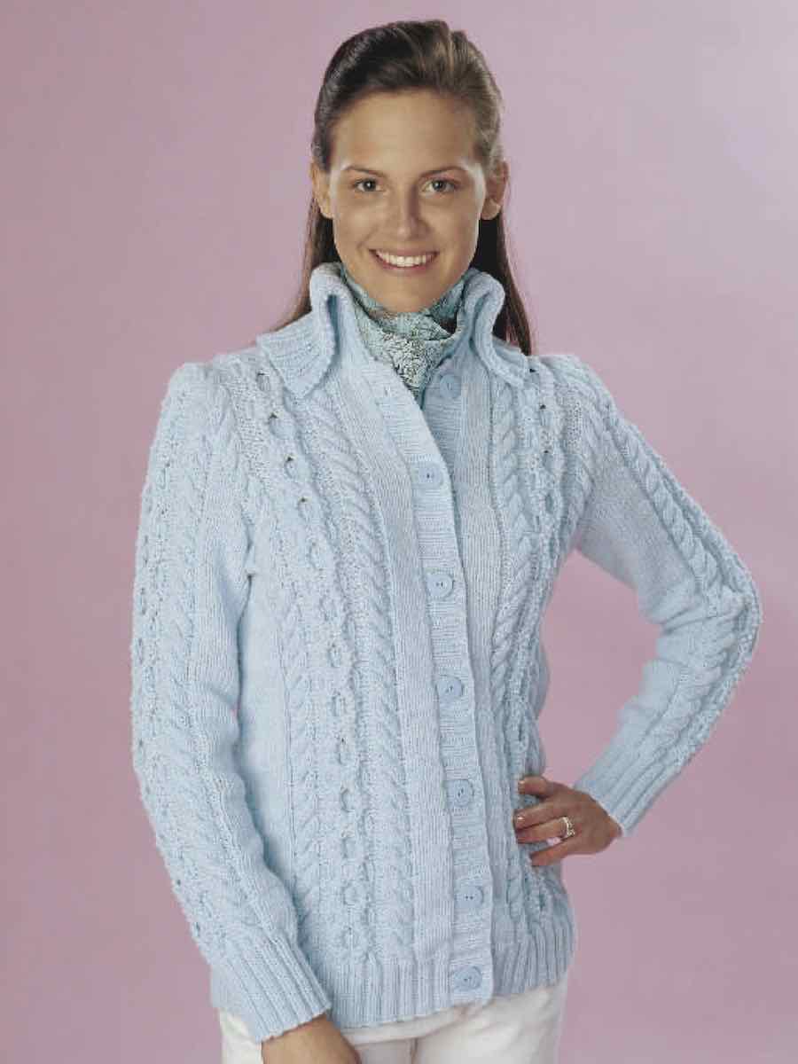Cardigan med vakre fletter. Strikkes i deler nedenfra og opp med flettemønster foran og på ermene. Formet med strikk, glattstrikk og fellinger. Avsluttes med elastiske kanter, krage og knapper for et klassisk utseende.