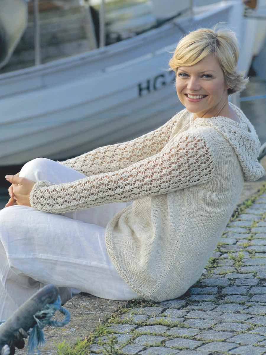 Genser med blondeermer og hette. Bolen strikkes i glattstrikk, ermer og hette i hullmønster. Hetten strikkes separat og sys på. Avsluttes med skulder-, erme- og sidesømmer.