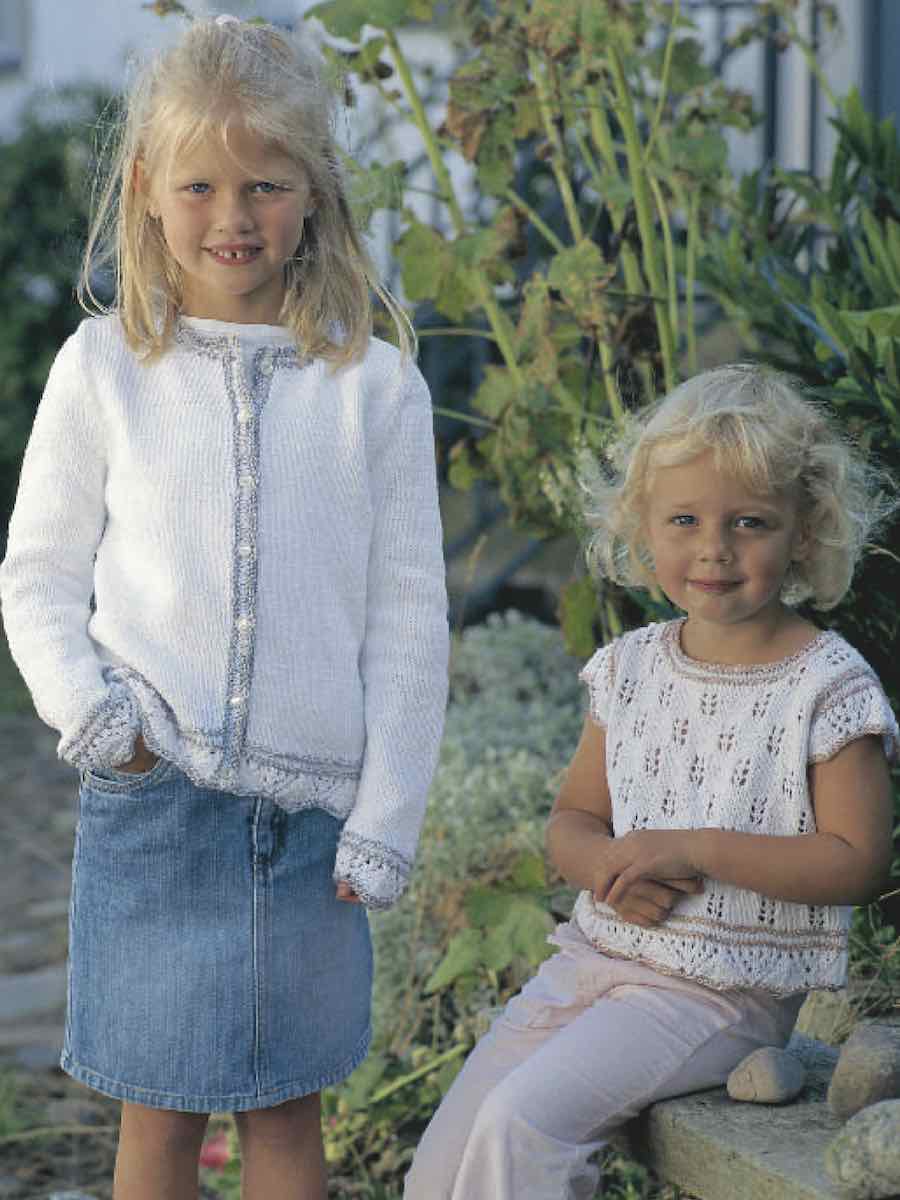 Genser og cardigan i barnestørrelser er strikket i to farger og med dekorative mønsterkanter. Genseren er strikket med innsydde ermekanter, cardiganen er i ett stykke opp til ermehullene. Begge modellene har en tydelig struktur og en klassisk passform.