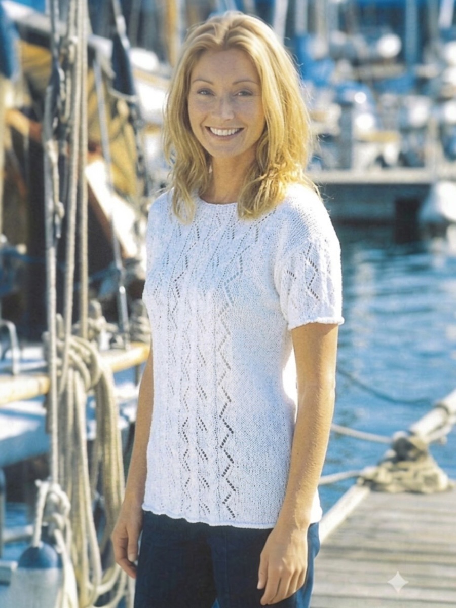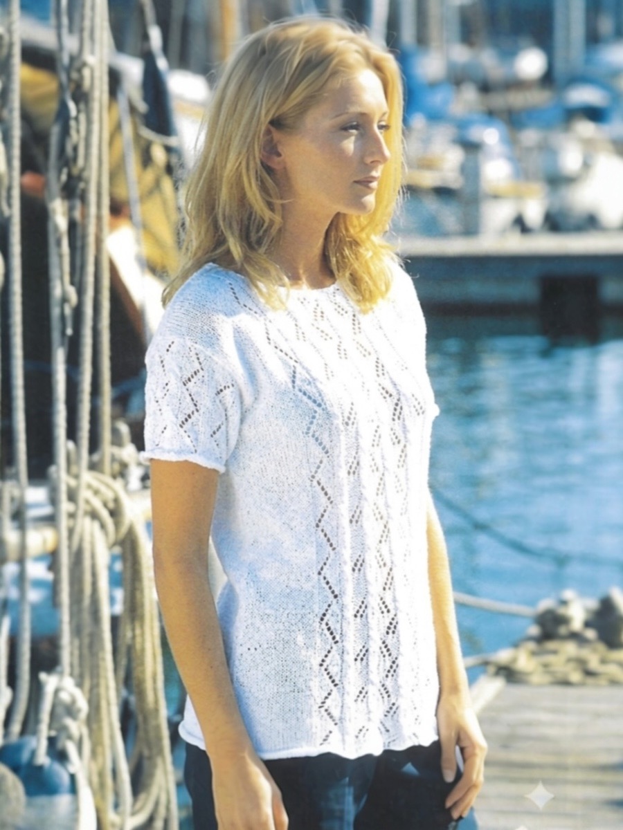 Genseren strikkes etter diagrammet, med løftemasker og felles. Strikk bakstykket, forstykket og ermene separat, og form til hals og skuldre.