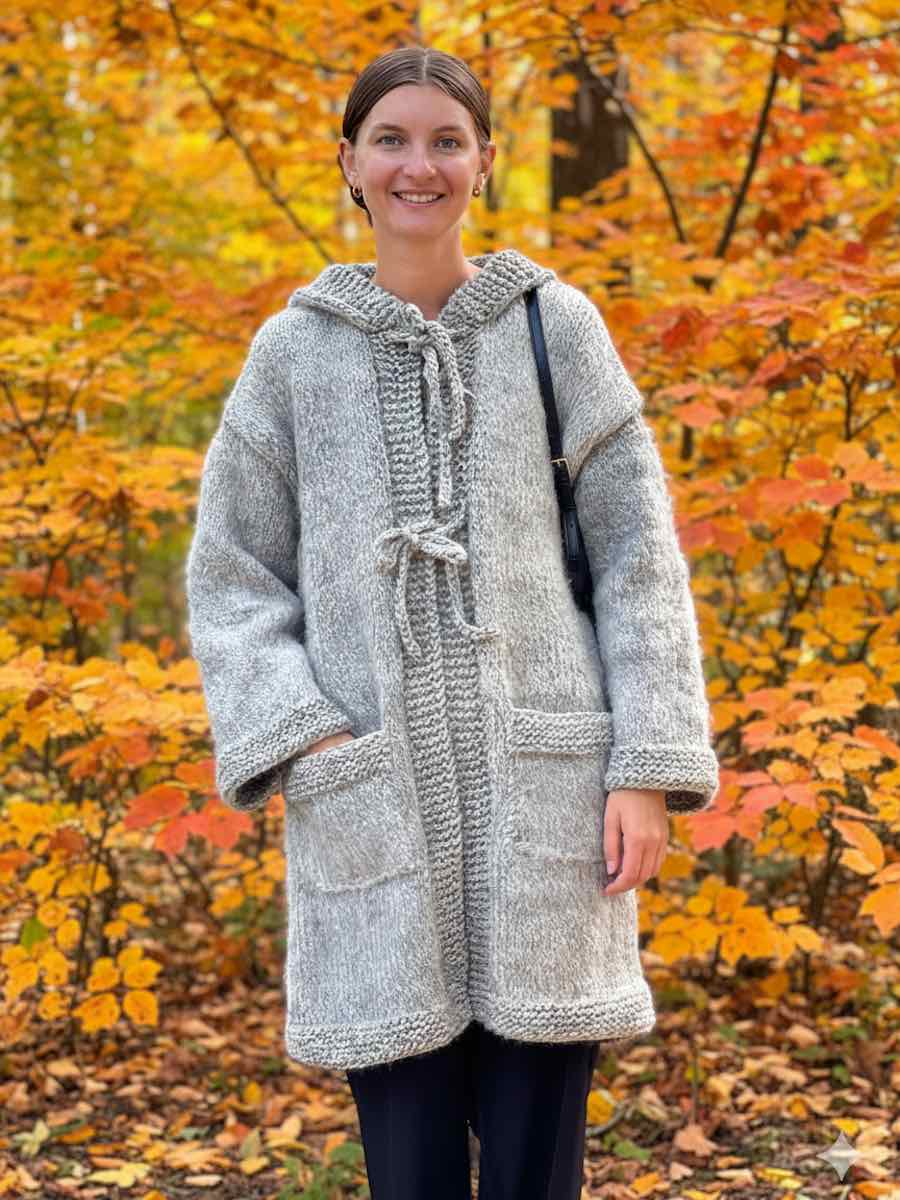 Kåpen er strikket på tradisjonell måte. Fra bunnen og opp. Forkantene etterbehandles og sys på plass. Hetten strikkes separat og sys fast. Pelsen er ru på de glatte partiene.