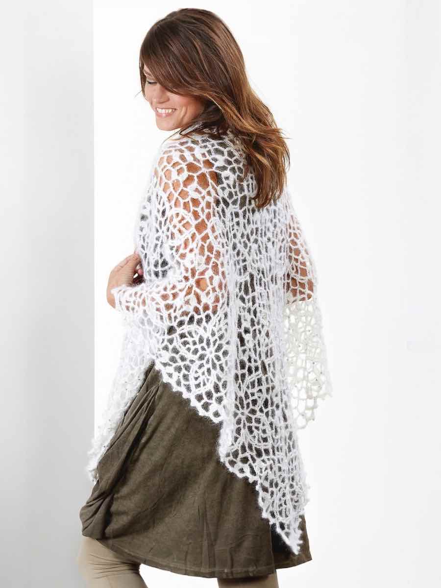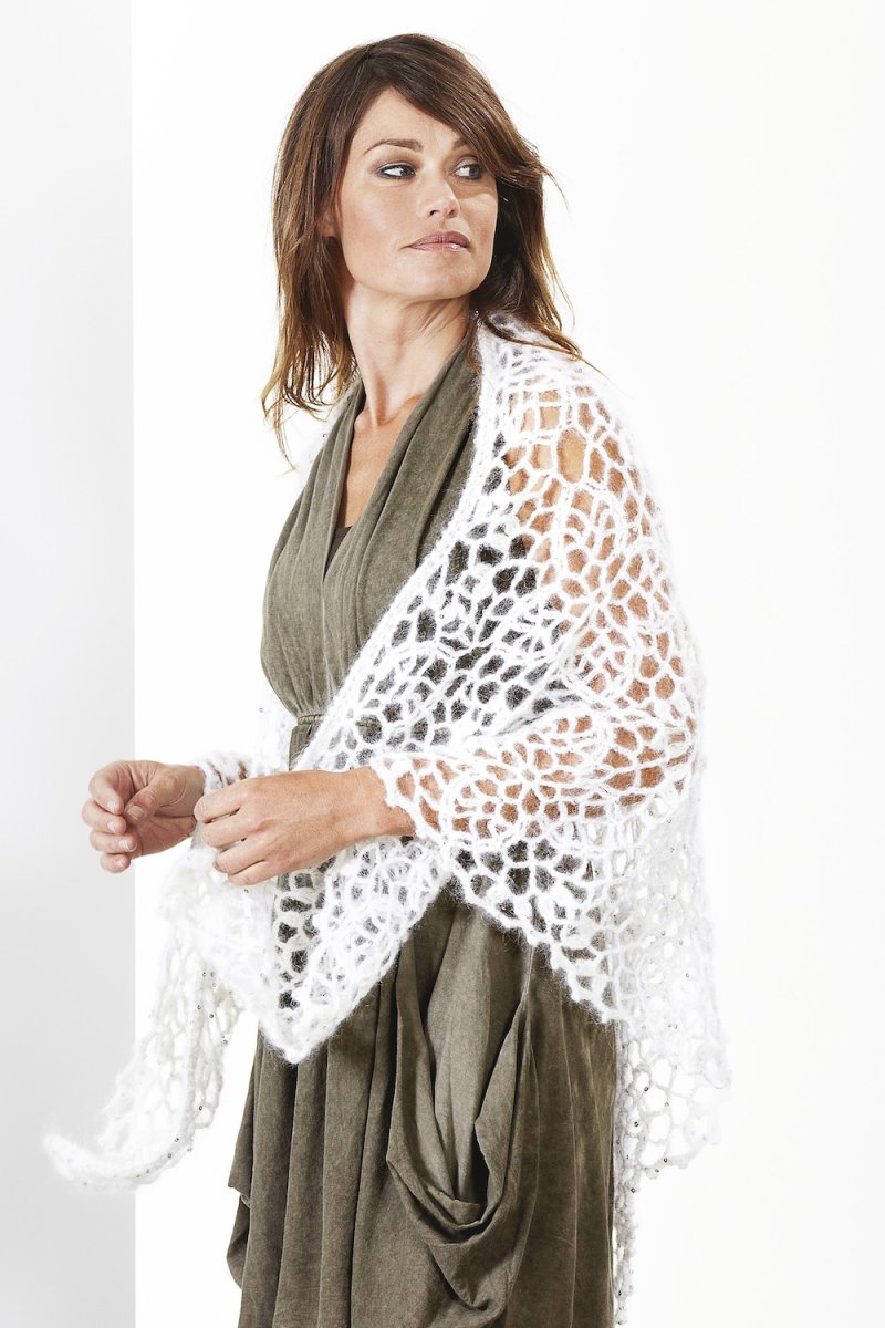 Dette elegante sjalet er laget av 15 hele ruter og 6 halve ruter som er heklet sammen én etter én for å skape den karakteristiske trekantformen. Hver rute er heklet i fem omganger med luftmasker, staver og staver sammen for å danne et dekorativt mønster. Når rutene er satt sammen, avsluttes arbeidet med en kant av fastmasker og dekorative picoter langs sidene.