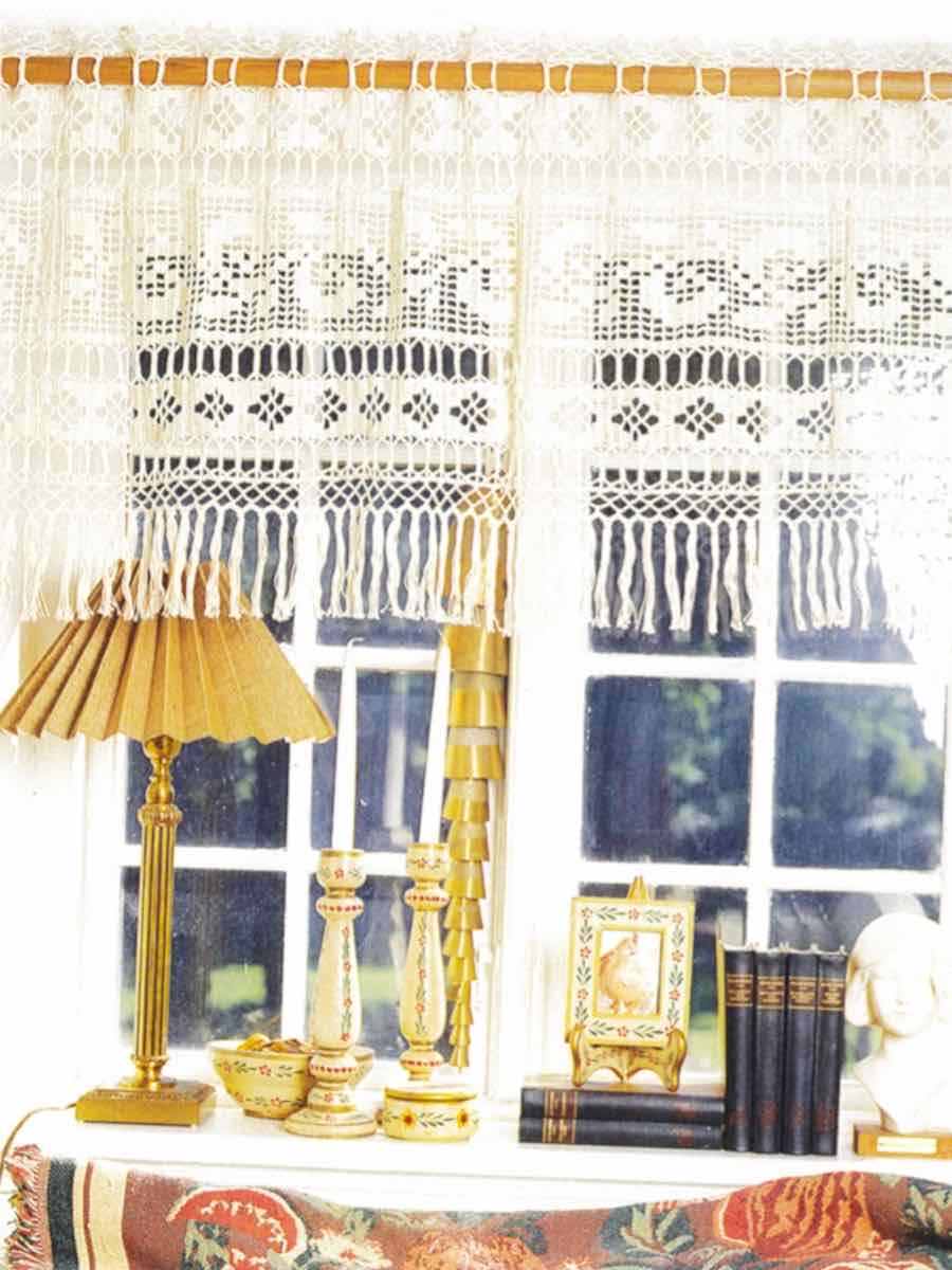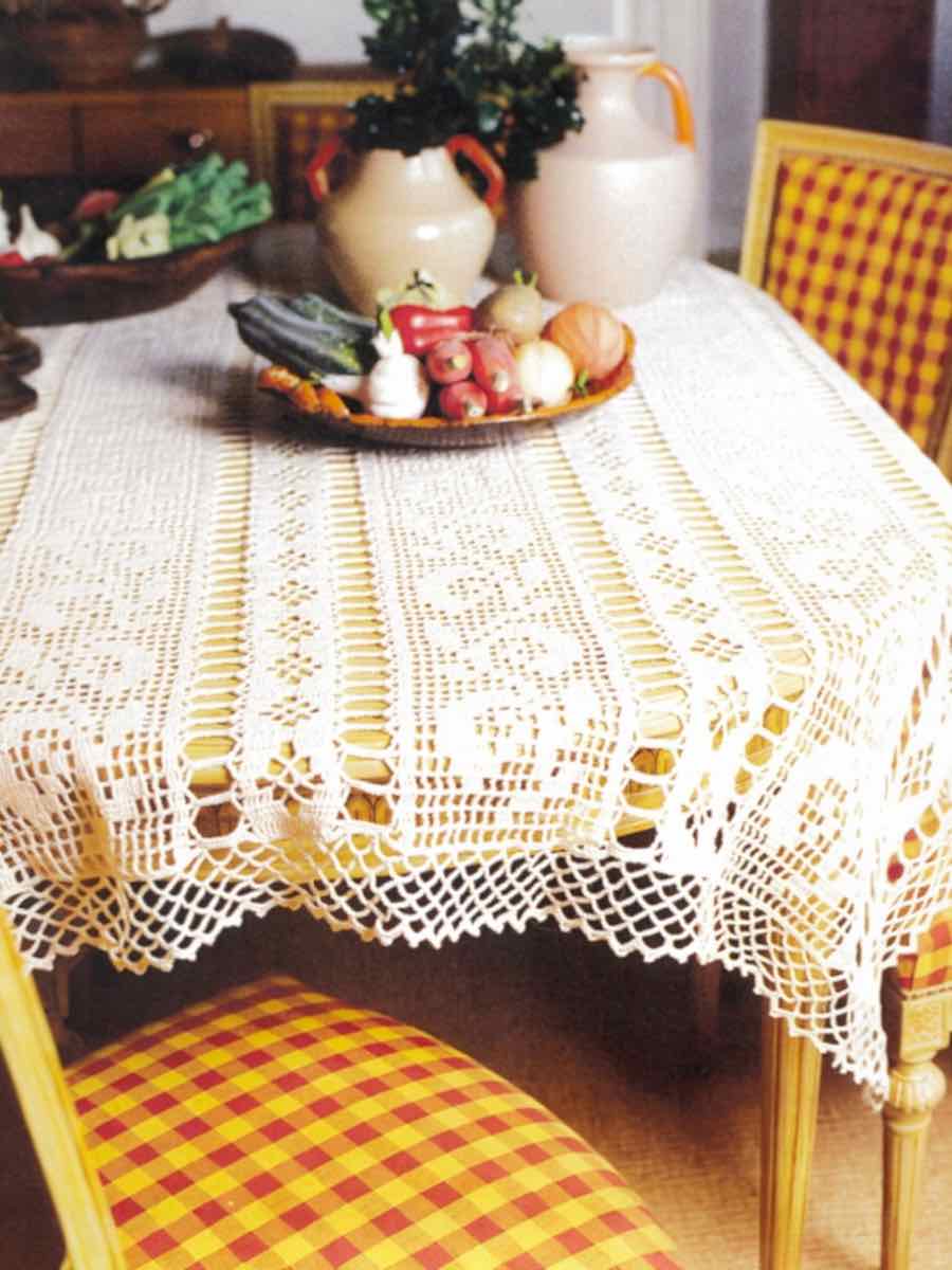 Denne duken og gardinkappen er heklet med luftmasker, staver og dobbeltmasker i henhold til diagrammet. Økninger og gjentakelser. Hekle fra retten på rettsiden og fra venstre på vrangen.