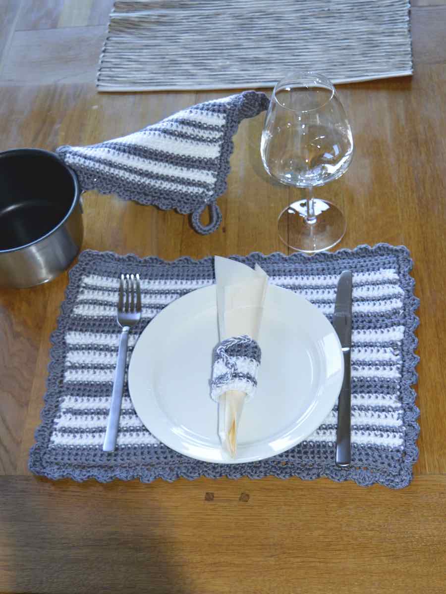 Bordbrikken og grytekluten hekles i stavmasker der hver omgang bygges opp av fastmasker i for- og bakre maskeløkke. Stripene følger et gjentakende fargeskjema. Når høyden er ferdig, hekles en spiss kant rundt hele arbeidet med stavmaskegrupper i hjørnene for en jevn form.