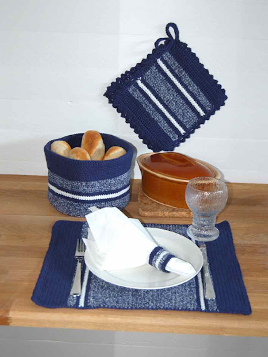 Bordbrikker, grytekluter, serviettringer og brødkurver er heklet i bomullsgarn med fastmasker, luftmasker og kjedemasker. Mønstrene er heklet i striper og former, noen med dobbelt garn. Perfekte nybegynnerprosjekter med praktisk bruk.
