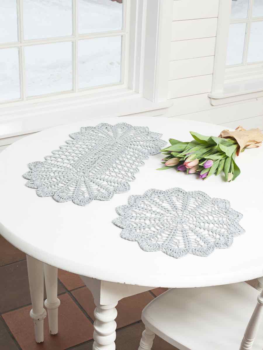 Hekle en duk eller løper i mercerisert bomull med luftmasker, staver og staver/tredobbeltmasker i henhold til diagrammet. Start i midten med en ring med luftmasker, fortsett rundt med mønsterradene og øk jevnt fordelt.