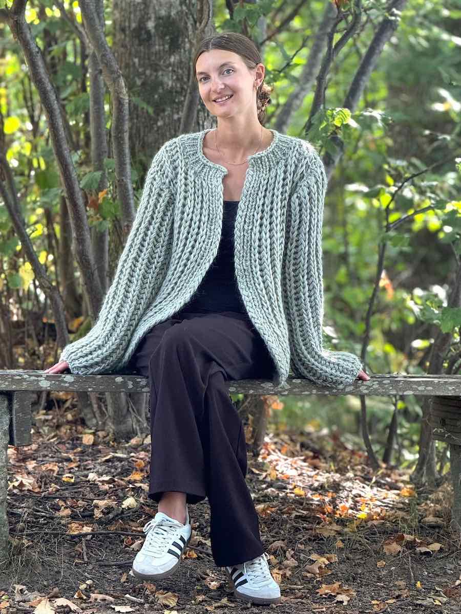 Patentstrikket cardigan strikket på tradisjonelt vis i fire deler som er sydd sammen.