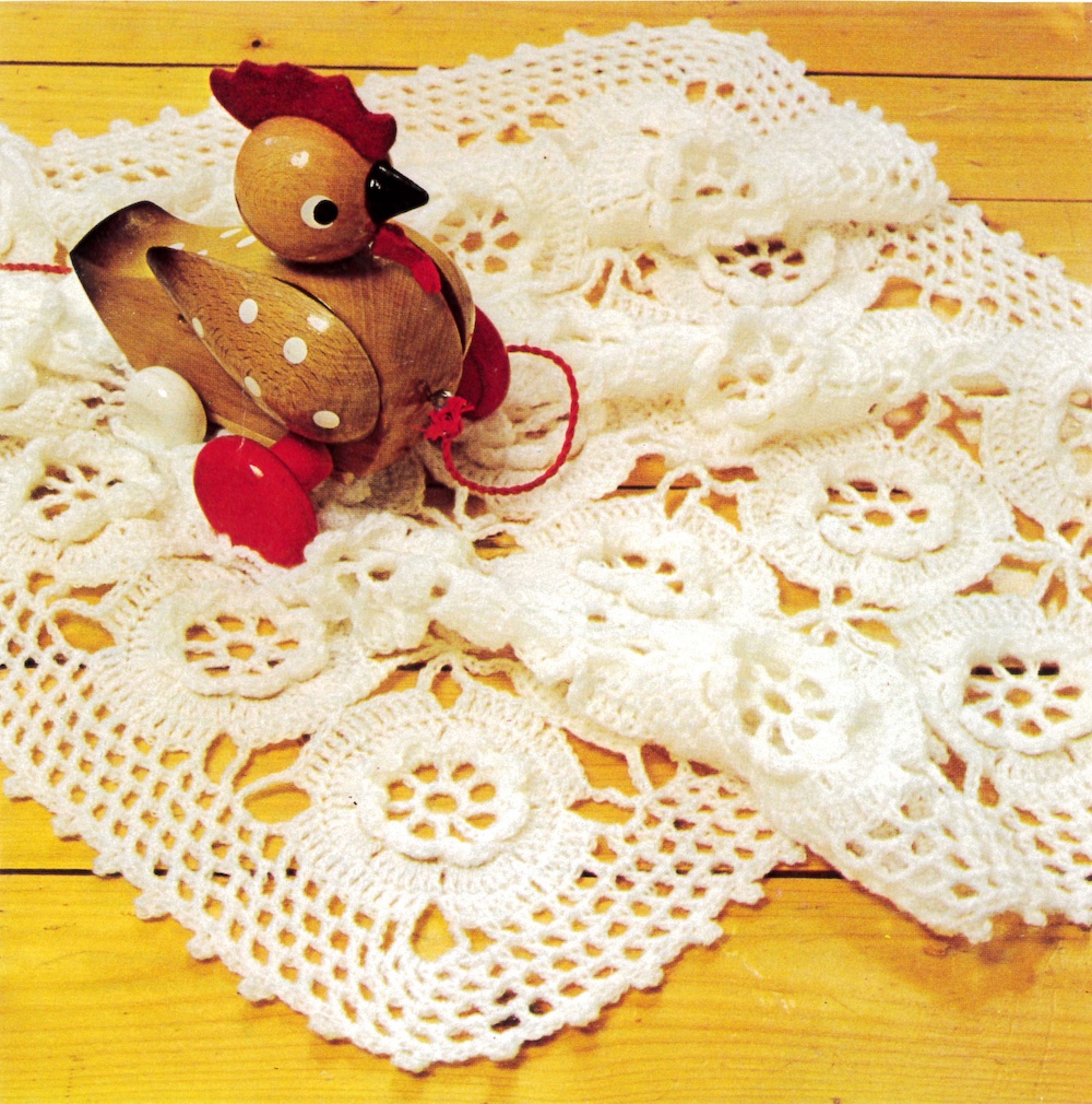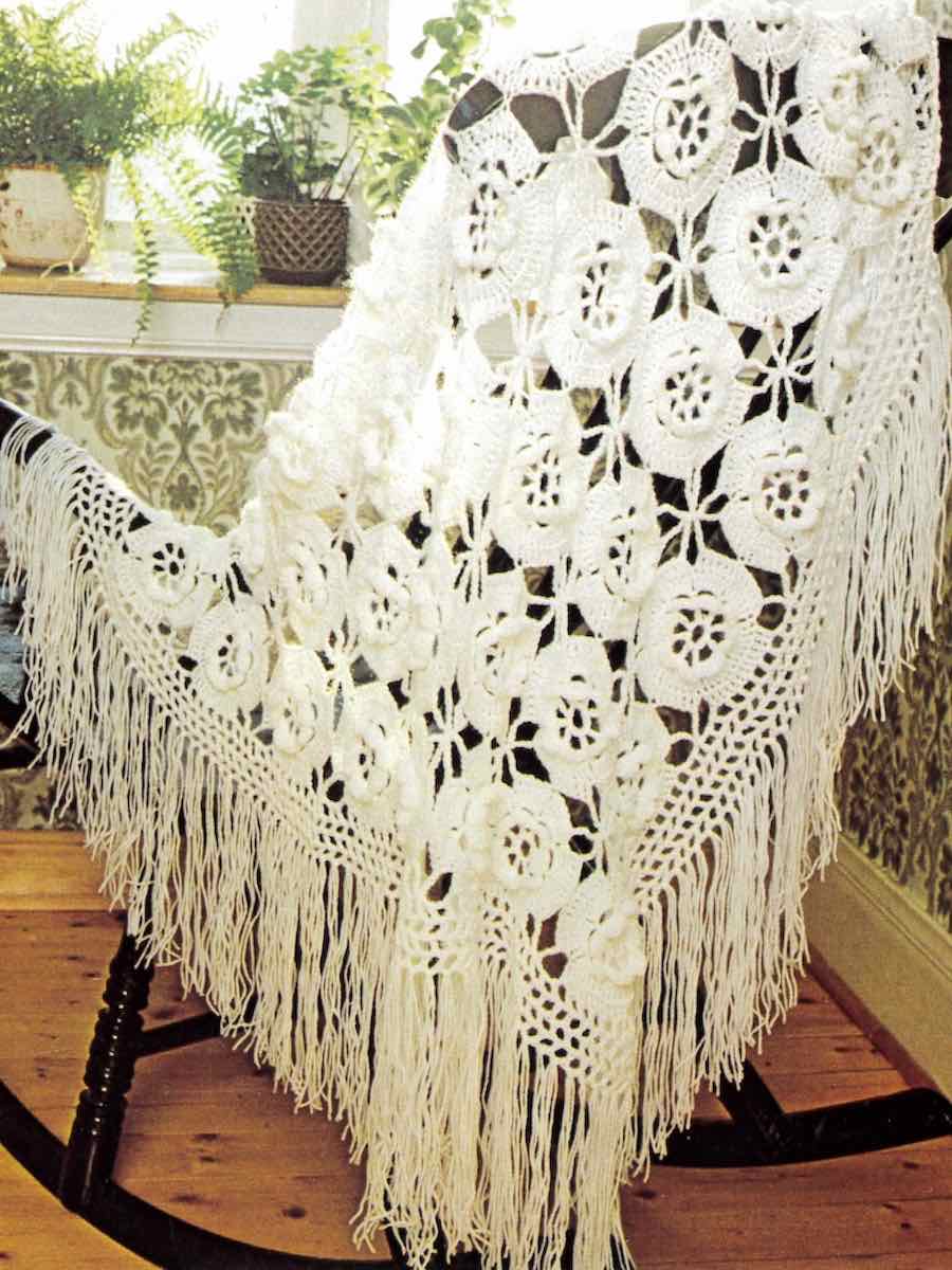 Små blomster er et fantastisk sjal eller babyteppe. Blomstene hekles sammen en og en til ett helt stykke. Sjalet har en fin frynser rundt seg.